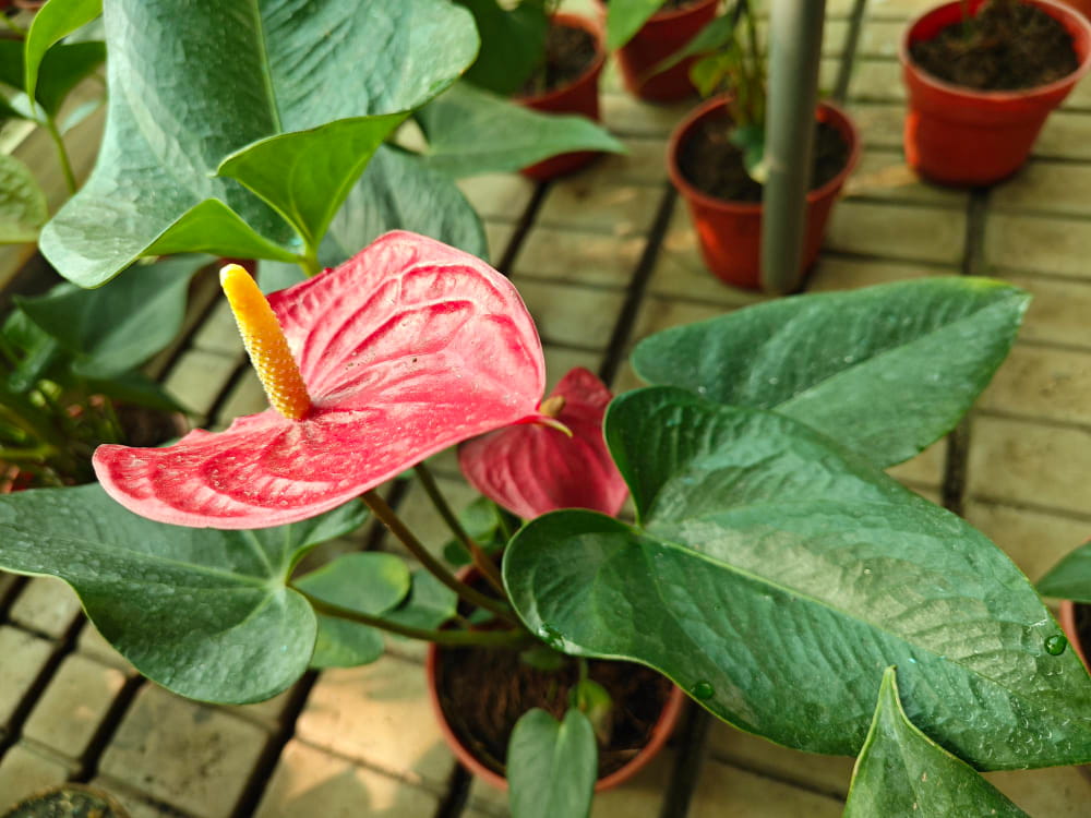 Anthurium podophyllum cultivé en pot dans une serre, présentant de larges feuilles vertes et une fleur rouge surélevée